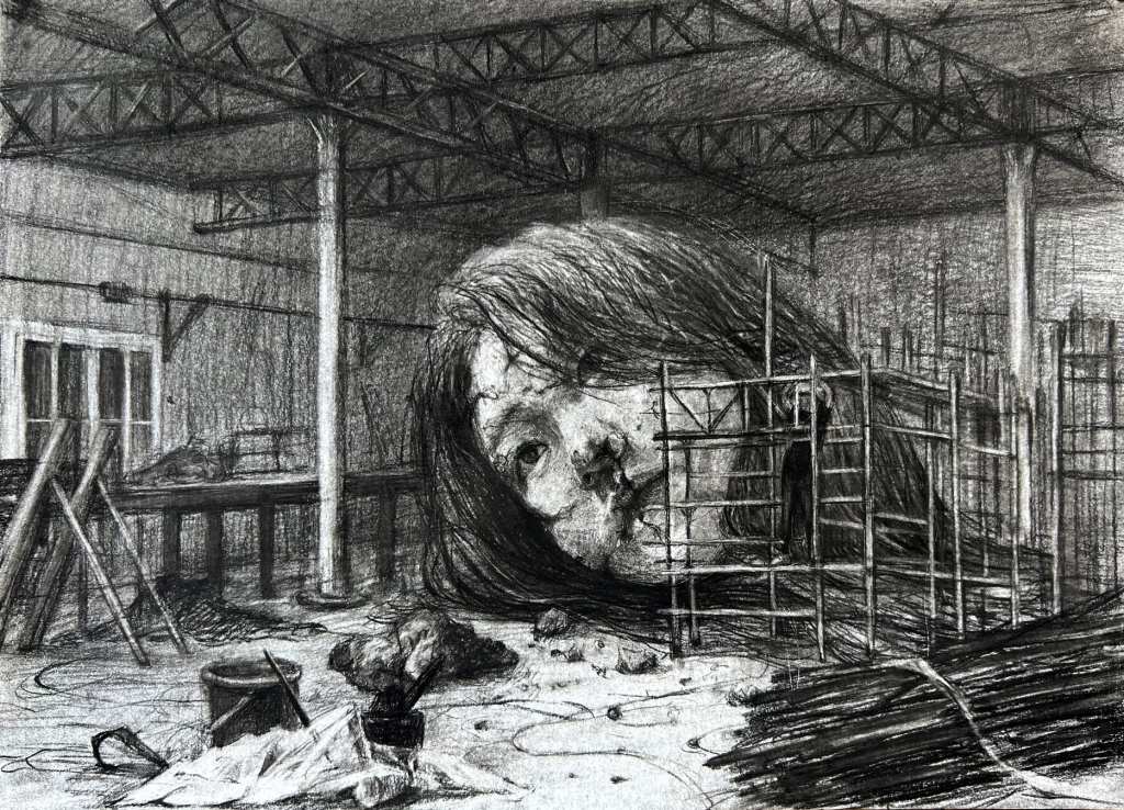 The appearance standard that I think of is dark eyebrows, big eyes, a high nose, thick lips, a slim face, and fair skin. These days, the general public and celebrities are trying to meet the beauty standards by plasticizing their faces and photoshopping their photos. As a result, it seems that the standards were born. People become more confident and happy when they meet their beauty standards. However, it is not good for our mental health because the more we obsess over beauty standards, the lower our self-esteem can be. The “head” in this painting expresses “me” who constantly fixes herself to become more perfect, but is further broken due to excessive greed. I tried to express the rough atmosphere of the construction site where various materials are scattered by using charcoal. I want to convey through this drawing that if you don’t fit the beauty standards that the world says, then you should be the new standard.