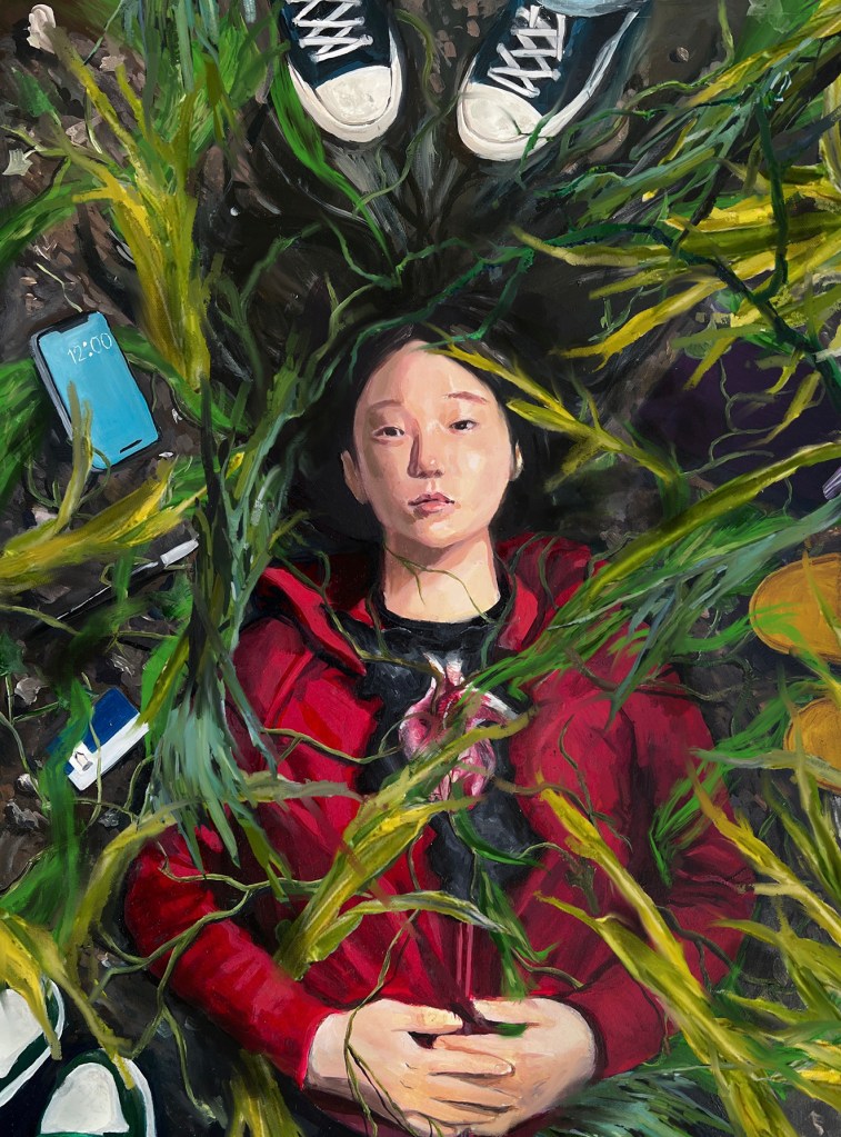 This artwork illustrates the pain and indifference of others. Most people might have gone through adversity. Some people may ask others for help, overcome alone, or indicate they are in need of help. Nonetheless, people nearby may notice your distress but refuse to assist. The rotting heart surrounded by the cement and the dried plant represents adversity, and the three people with their shoes imply people ignoring people’s help. Since people tend to be easily emotional during their teenage times, there are also a smartphone, a brush, a student ID card, and a textbook which all refer to the girl’s status as a student. Additionally, the use of oil paint makes the artwork more realistic thereby emphasizing the girl with the rotten heart.