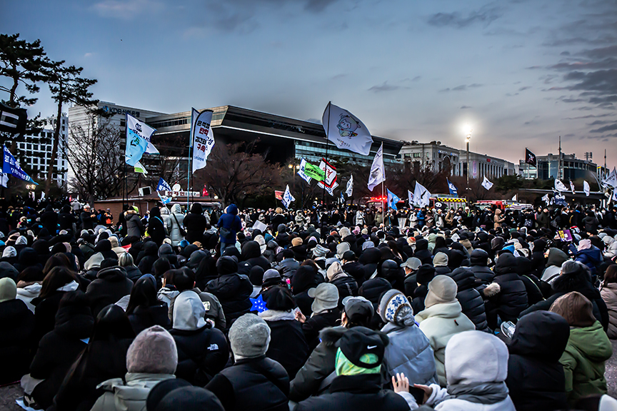 The power of the image lies not in confrontation, but in presence. It shows how protest can carry urgency and solidarity without descending into chaos. This moment reflects the essence of democracy—not always loud or forceful, but enduring, human, and collective, even in the face of repression. Bundled against the cold, seated in orderly lines, and illuminated by the fading dusk, the protestors embody a powerful, nonviolent resistance—one that speaks volumes without needing to shout.