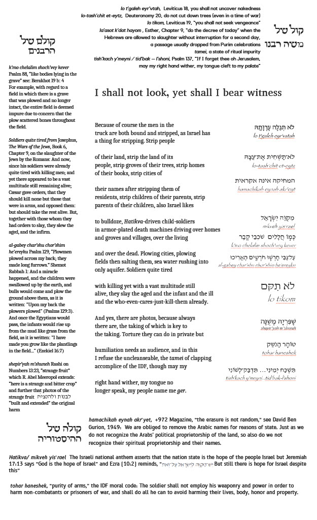 This is a multi-layered poem/text. It begins as a poem of witness, about one of the horrible photos of Palestinian men and boys stripped and bound and thrown into a truck to be hauled away. Then there is a counter-poem with phrases in Hebrew from all across Jewish textual traditions including Torah, Talmud, and documents from modern Israel. For each of the those phrases, arranged around the two central poems, are series of notes that don’t just translate but provide context, a passionate argument against the genocidal violence of the Israeli government that rises up from deep within Jewish tradition. The entire page is arranged as a page of Talmud, the set of Jewish texts which recorded the arguments that rabbis had back and forth for centuries. It is a form immediately recognizable to most (not all, but most) Jews, but you don’t have to have that immediate recognition to enter into the text. Honestly, it is a strange monster, this poem, its words and shape taking form as a container for my fury and my grief.