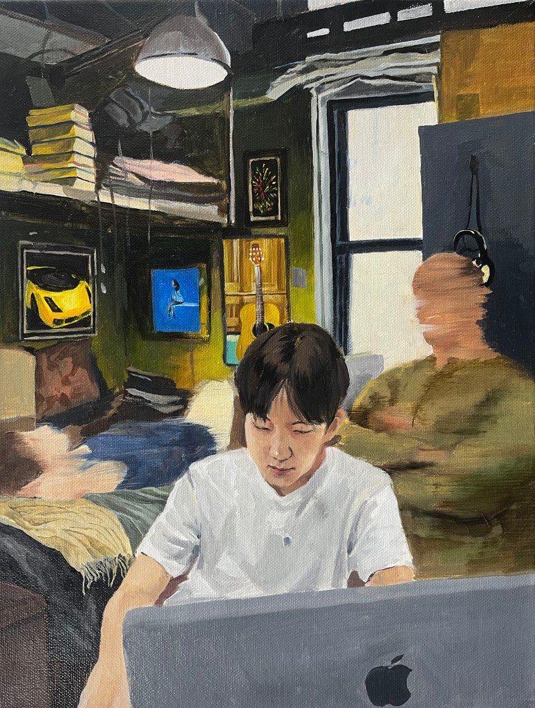 This work explores how digital life reshapes our sense of connection and community. In the painting, three people share the same physical space, yet only one—the boy in front of the screen—is clearly visible. The others fade into the background, blurred and ghostlike, as if gradually being erased.