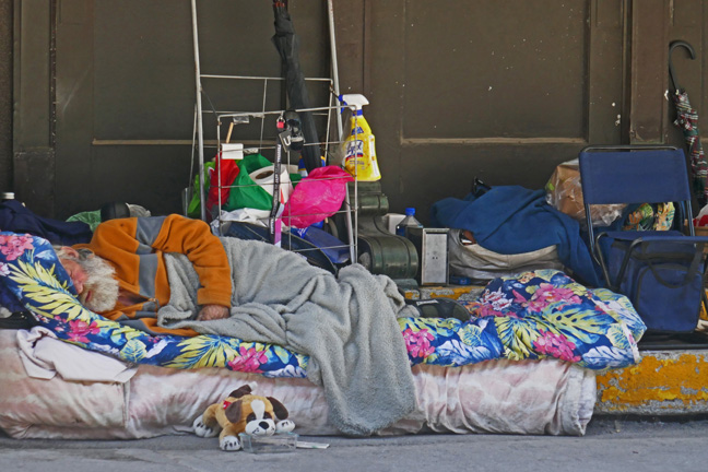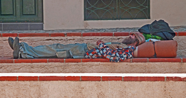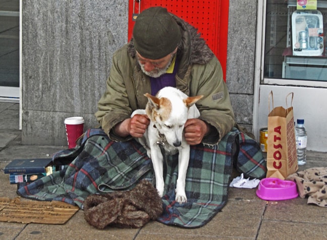 “A Recent Development” Man and dog sit outside a major department store along the main drag in Edinborough. He looks up at no one.