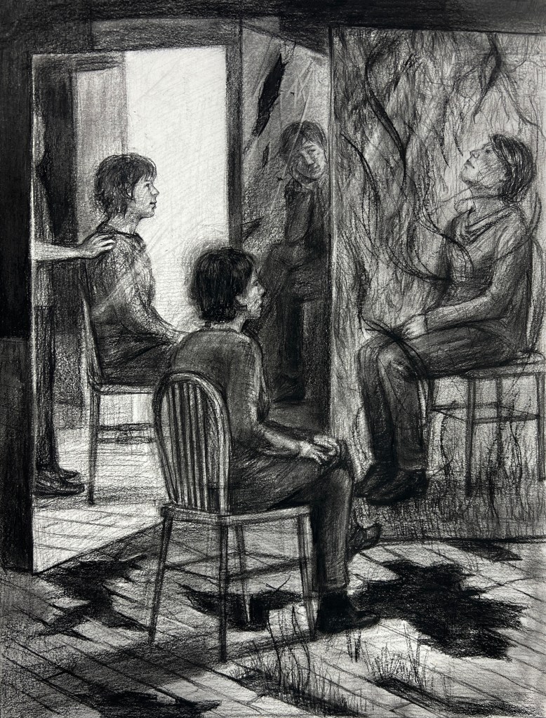 This artwork portrays a figure confronting various reflections of herself in mirrors during a moment of crisis. Each reflection represents different realities and inner emotional states, most of which depict isolation and suffering. However, the figure in the leftmost mirror uniquely experiences comfort through a gentle hand resting upon her shoulder, symbolizing warmth, consolation, and solidarity. Through this piece, I aim to express that the strength to overcome hardships comes not from isolation, but from relationships and communal support.